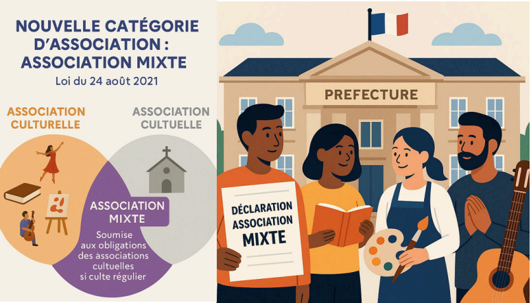 Les associations sont considérés “Mixtes” si elles ne se consacrent pas exclusivement à l’excercice public d’un culte mais organiste régulèrement des cérémonies ou autres tout en menant des actions non culturelles